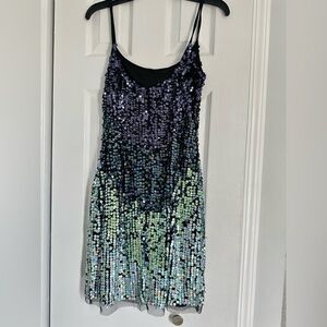 Black spaghetti strap dress has sown in blue and green sequins giving an ombré effect. Perfect for any special occasion.