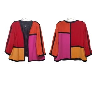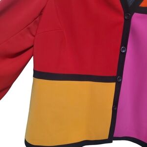 Bold colorblock blazer jacket by Sandra. True Vintage. Bold colors with contrasting black outline and stripes down each sleeve. V-neck. Button front. Fully lined, black satin like lining, looks great with sleeves rolled back. Oversized fit. Shoulder pads for extra structure. Easy to throw on and dress up any plain outfit! Wear all year! Business casual or a funky spring fling concert. One of a kind!