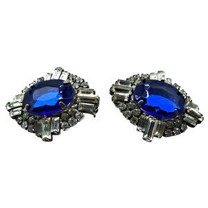 Elegant vintage rhinestone earrings feature a stunning blue and clear design. Perfect for special occasions or adding sparkle to everyday outfits. Pierced post style ensures a secure fit. These earring are a bit of the mystery because the setting looks older but the blue stone is not glass. They may have been professionally converted from clips to posts. They measure 1 1/4" long x 1 1/8" wide. All rhinestones are prong set.