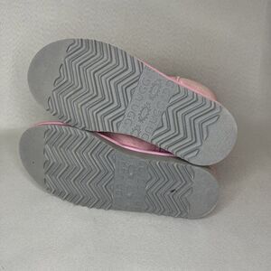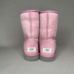 Women's pink UGG boots, Classic Short. They are a size 7 and perfect for a range of occasions, from fun casual wear to festival wear to school, travel, and holidays. They feature a pull-on closure, suede upper material, and sheepskin lining material for ultimate comfort. The boots are also cushioned, water-resistant, and have a rubber outsole material with a wool insole material.