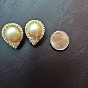 Vintage Ciner Earrings Gold Pearl Tear Drop Clip On Rhinestones Large