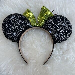 Halloween Disney ears with soft spiderweb ears, green sequin bow and purple/magenta spider. Purchased from Etsy, worn once. Oogie Boogie Bash ready!