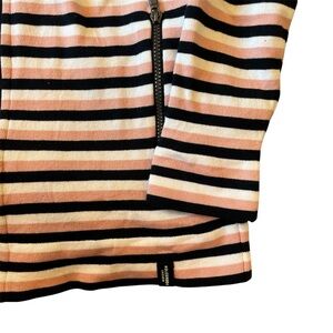 HOLEBROOK Sweden women's "Jennie" hooded, windproof, long raglan-sleeved, zip-front, striped cotton knit jacket. Women's size L This beautifully-made, substantial, 100% cotton-knit jacket features a metal full-zip front, zippered pockets, a drawstring hood, and full polyester blend lining. In a wonderful stripes of pink, white and navy.