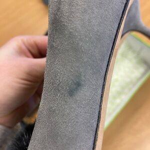 These Butter heels feature a sleek pointed toe design in a soft gray color complemented by a striking black pom-pom detail on the vamp. The bottom of the soles do show some wear and there is one spot of discoloration featured. They still have plenty of life left and are perfect for the office or a night out!