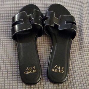 Step into style with these Crown & Ivy black slide sandals. Perfect for any casual outing, these sandals offer both comfort and elegance.