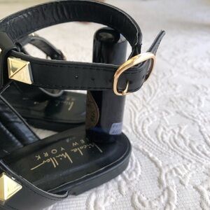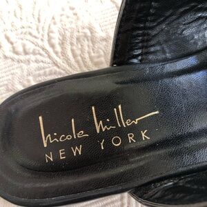 Nicole Miller Black Tulum Gold Studded Ankle Strap Pointed Flat Loafers. Gold suds throughout straps. Double strap over foot and a strap around your ankle. Pointed toe. Metal buckle closure.
