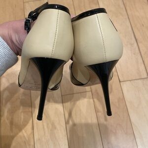 Please see all photos for signs of wear, including: light scuffs on leather exterior, wear to bottom soles, wear to inner soles, and bending of ankle strap and buckle (very much still fully functional)