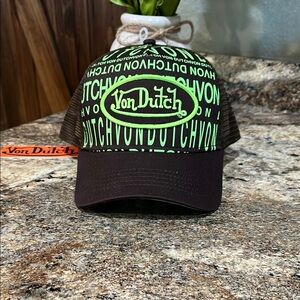 Stylish Von Dutch cap with bold green logo. Perfect for casual wear.