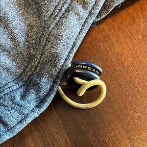 This NIKE Jumpman windbreaker showcases a light gray body complemented by navy blue accents on the collar, creating a stylish athletic look. The full-zip design features rich gold zippers/accents and a prominent Jumpman logo on the chest, making it a standout piece for any active wardrobe. You will love the style & comfort!
