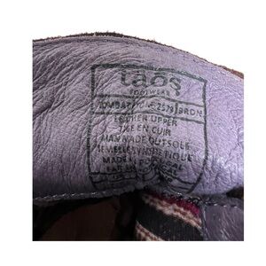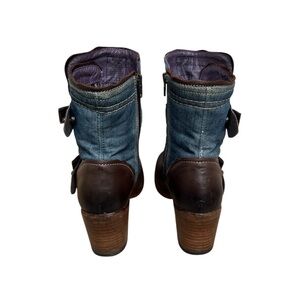 Taos Tombat Leather and Denim Womens Boots. Size 38 or US 7-7.5. Has denim for shaft. Side zipper. Weathered leather straps with antique bronze metal buckle accents. Great craftsmanship. Soft inside. Great condition.