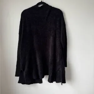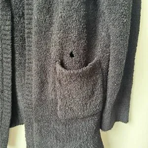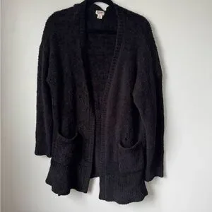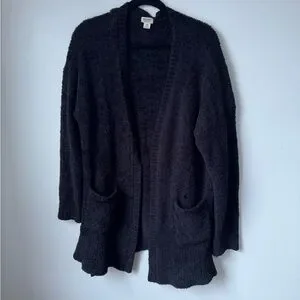Black fuzzy sweater/cardigan. Good condition but one hole (pictured). Has two pockets, open with no buttons
