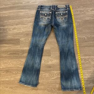 Good condition Rock Revival Shaina Easyboot 28 are women's bootcut jeans in a blue color. The jeans are a size 28, regular fit, and feature the Rock Revival brand. Pet free smoke free home