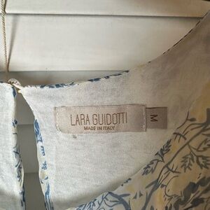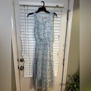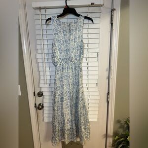 Blue and white floral dress with a flowy silhouette, featuring a back zipper