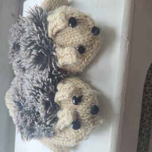 Warm cotton knitted mitten featuring lovely hedehog with black soft thorns in the back.