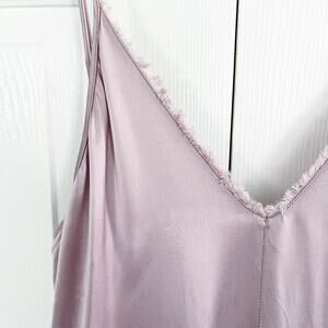 Adjustable spaghetti straps. Midi/maxi length. Front seam. Frayed v-neckline. Open back panels that can be knotted. Modeled photo for similar fit reference.