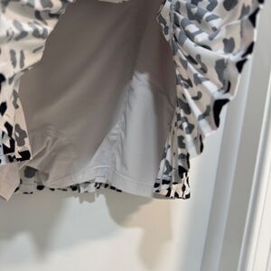 This stylish tennis mini skirt showcases a bold black and white leopard print that adds a touch of flair to your night out. The tennis style is enhanced by a playful ruffled hem, creating a fun and flirty silhouette that is perfect for casual occasion. Attached short with ball pocket. elastic waist