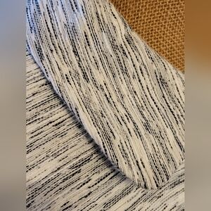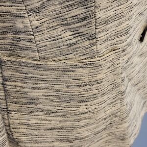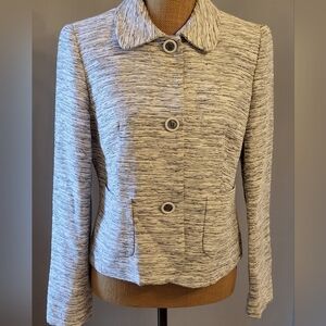 Louben Black and white woven cotton blend jacket with 3 button closure, no button cuffs, rounded collar, patch pockets, and a gray polyester lining.
