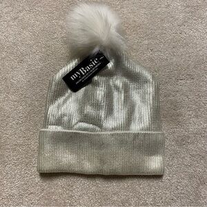 NWT Women's Metallic Silver Pom lined Beanie Cuffed Stocking Cap Hat