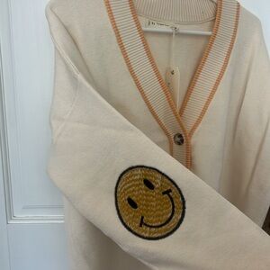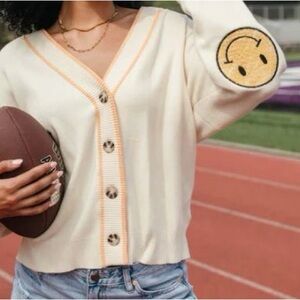New with tags & never worn, this cream cardigan will remind you of vintage varsity sweaters worn back in the day with modern details! Smiley face elbow patch. Super soft and cozy. Size medium. V neckline.
