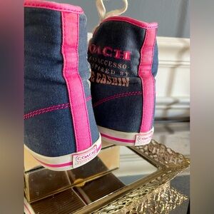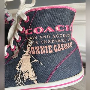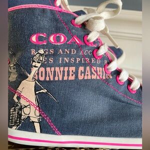 Rare high top sneakers from the Bonnie Cashin Coach Line! Adorable denim look with pink and white accents and fun artwork! Full lace up design! Size 10 women. Some minor signs of use on sneakers but overall in very good condition!