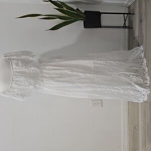 This charming white gown features a tiered and ruffled design that flows gracefully to the floor. The off-the-shoulder neckline and short flutter sleeves enhance its romantic appeal, making it an ideal choice for a bride. Crafted from delicate fabric, this dress embodies elegance for your special occasion.