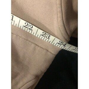 This Everlane sweatshirt is a women's XL size in beige, made of 100% organic cotton fleece. It features a 1/4 quarter zip, mock neck, and long sleeves with a pullover style. The design includes embroidered accents, a logo, and pockets. Suitable for various occasions like travel, activewear, and casual wear, this sweatshirt is heavyweight and breathable, ideal for winter, fall, and spring seasons.
