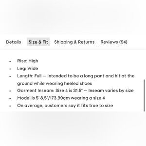 Garment Inseam: Size 4 is 31.5" — Inseam varies by size