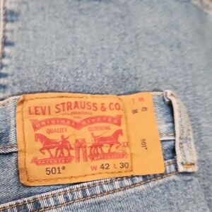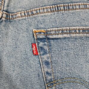 These Levi's jeans feature a classic light blue stonewashed look with a high-waisted design and a straight leg cut. The smooth denim texture adds to their timeless appeal, making them a versatile addition to any wardrobe.