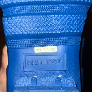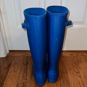 These tall winter and rain boots by Hunter feature a vibrant royal blue color and a glossy waterproof finish. Designed for functionality, they provide excellent protection against wet conditions while ensuring comfort with a rounded toe and flat sole. Size 8. Good Condition. Also have a matching rain coat listed.