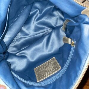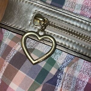 •COACH•POPPY DAISY MADRAS MULTI-COLORED SIGNATURE CANVAS CHECK SHOULDER/CROSSBODY BAG EUC. Excellent condition. Absolutely no rips, stains, tears, or holes. Made of pastel plaid printed signature "C" canvas with leather trim and gold-tone hardware. Has adjustable shoulder/crossbody strap, zip top closure, front zipper closure pocket, and 1-back slip pocket. Light blue sateen interior fabric. Includes one inside zipper pocket and two inside slip pockets. Heart shape front zipper pull with "coach" logo and gold poppy collection logo exterior patch and interior shiny gold creed patch. Very Gorgeous pastel spring like colors, From poppy collection.