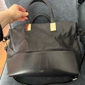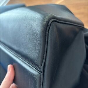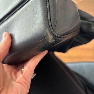 Italian leather bag. Can be carried with top handle or with longer strap for crossbody or over shoulder. The long strap can be removed. Inside is clean as shown in pictures. No stains or holes. The outside shows some signs of use on the bottom corners (shown in last 4 photos). Very small signs of wear on the outside sides of bag.
