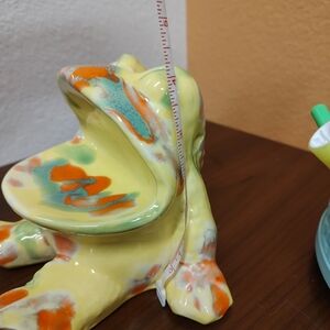 This vintage 70's Frog Soap Dish Toothbrush Toothpaste Holder is a charming addition to any bathroom. Made of ceramic with a glazed finish, it features a free-standing design in multicolor hues of orange, yellow, and green. The set includes a frog character that holds 4 toothbrushes, toothpaste, and/orsoap, making it a functional and whimsical piece for all ages. Perfect for a retro-themed bathroom, this unique holder adds a touch of character and nostalgia to the room.