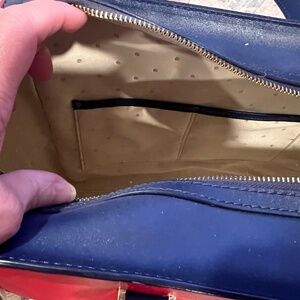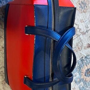 Red, blue and white spacious and beautiful bag. You can use for traveling or if you need a bag to carry baby items, for example, this bag is for you. The size is 11”H x 10”L x 6.5” W.