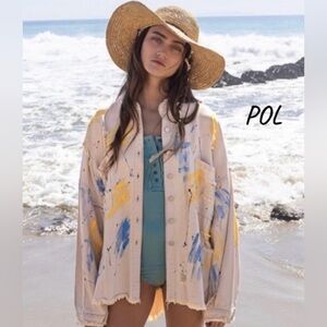 Trio Urban Black Distressed Denim Jacket with Smile on the Back and “have a nice day” in yellow on the Sleeve. Size M/L.