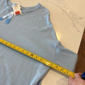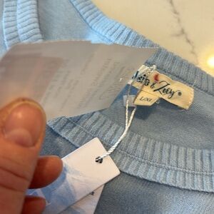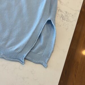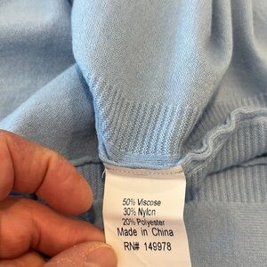 NWT, this is a poncho sweater that is a size large/extra large by elsie and Zoey. it is a powder blue and you can see in the pictures. The measurements the sleeves look a little silly, but that’s what makes the poncho sweater. There are slits on the side. Just a comfortable sweater to wear while relaxing on a weekend. You can also see in the picture with the materials are and the Care instructions.