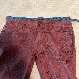 Stylish pink jeans with a textured pattern. Features classic five-pocket design. Perfect for casual wear. Rise 31”, Waist 15”, 98% Cotton, 2% Spandax.