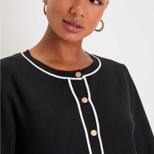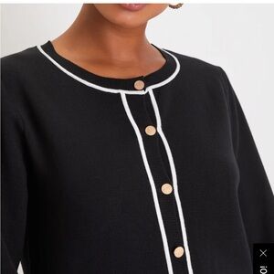 This elegant black dress features a chic white trim, perfect for any occasion. Its sophisticated design offers a timeless look.