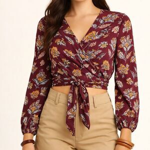 ILLA ILLA Rust and White Boho Tie-Front Bell Sleeve Crop Top Size Large