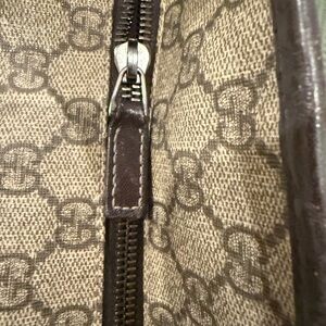 This spacious Gucci tote bag features a distinctive repeating pattern of interlocking GG logos on a light tan canvas body, enhanced by dark brown leather trim and sturdy handles. Its roomy design makes it perfect for daily use, allowing for easy access with a wide opening at the top.Preloved! The zipper is functional. This bag can be good for anyone who is also into upcycle products using this.
