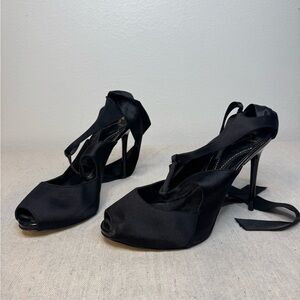 Satin and ribbon. T strap, peep toe. These are equal parts elegant and sexy. Bought for a premiere formal and never went.