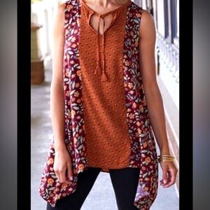 Matilda Jane Mix Print Floral Size Medium Sleeveless Front Tie Boho Blouse. Pullover style front tie, handkerchief sides. In good condition, 100% rayon material. Colors are sienna, cranberry, black, yellow, mint and orange.