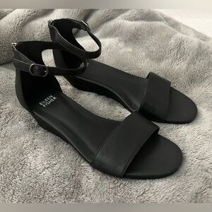 Excellent used condition Coach straw small tote with smooth black leather accents. Removable woven inner zipper pouch. Snap closure with brass logo. Some wear shown on metal feet.