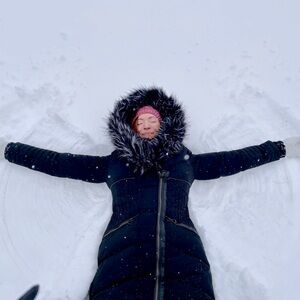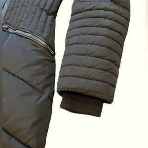 Functional front zippered pockets. Ribbed wrist cuffs provide extra warmth. Perfect for winter weather with a touch of elegance!