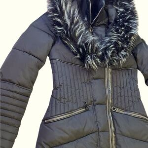 Stay cozy AND fashionable in this black puffer coat featuring a plush extra large faux fur-lined hood, quilted detailing, and a flattering fit-and-flare silhouette.