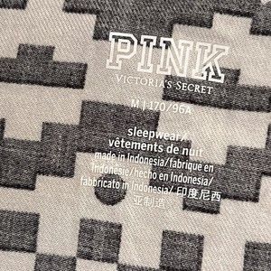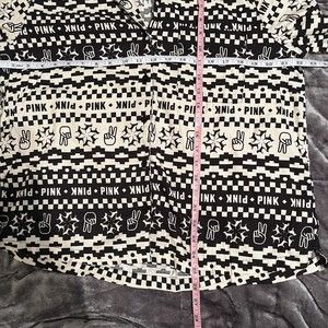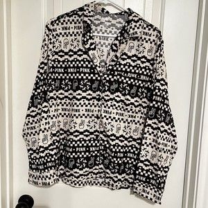 This Victoria's Secret Pink pajama top is a must-have for any woman's winter sleepwear collection. The black and white Fair Isle pattern with a peace sign motif adds a fun and cozy touch. The collared, long sleeve top is made of a cotton blend fabric that's perfect for snuggling up in on cold nights.