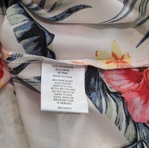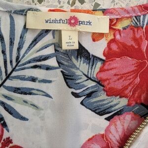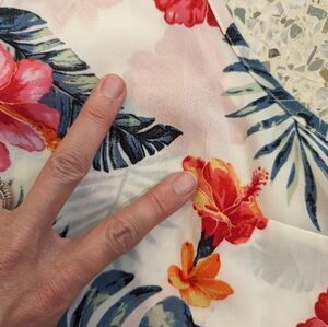 Lightweight with colorful tropical foliage print all-over, zipper lined v-neck. Borderline semi-sheer (would suggest wearing over bralette or camisole), there are a couple of runs in the fabric that look to be manufactured that way because there's no injury to the fabric. Size large.