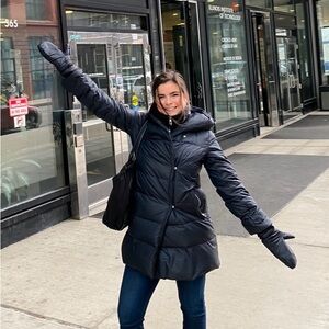 Cute and flattering puffer jacket in near new condition. White exterior with gorgeous purple trim.