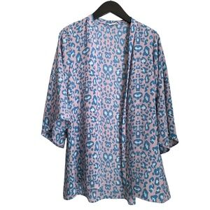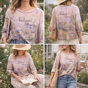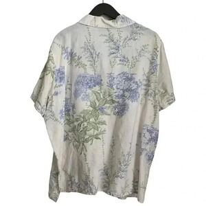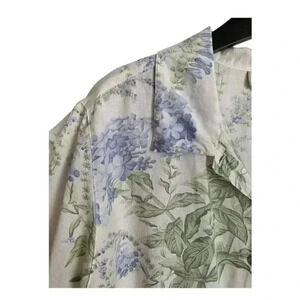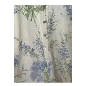 Beautiful linen cotton blend shirt with shell buttons and purple flowers!