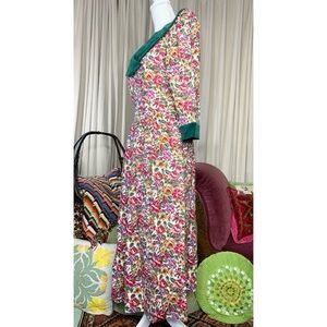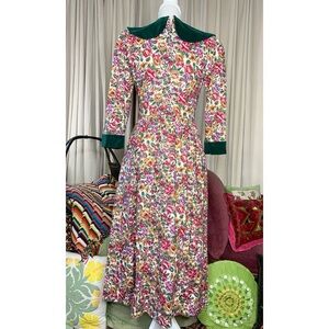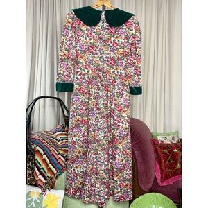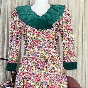 Awesome 80s vintage Lanz Originals floral dress with green velveteen collar and cuffs. Jewel tone rose print on ivory background, emerald green velveteen Peter Pan collar and cuffs. Powerful shoulder pads, side hand pockets, back zipper, pleated at waist skirt ends in a midi or tea length