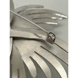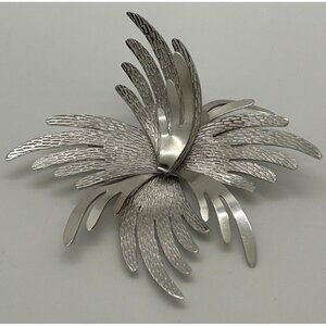 This vintage Coro brooch reflects the elegance of mid-century design with a sculptural starburst floral motif. The textured and shiny silver-tone finish adds depth and sophistication.